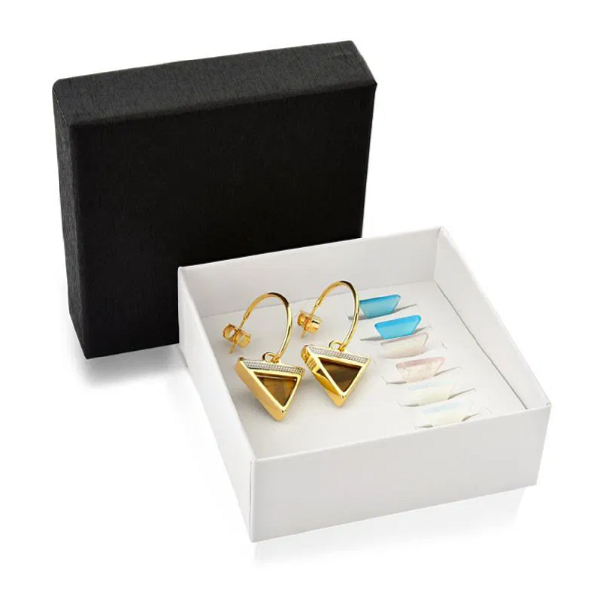 Brinco formato triangulo tipo relicário banhado a Ouro 18k com aplicação de Ródio Branco contendo 4 pares de Pedras variaveis em formato de triangulo acompanha caixa: Pronto para presentear.