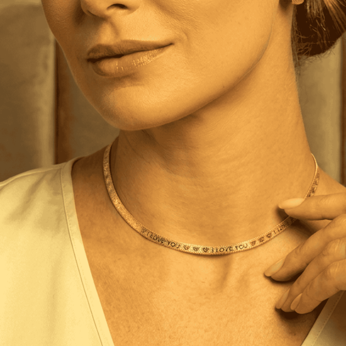 Colar Choker escrito I LOVE YOU Fita 4mm com 34cm de comprimento mais 10cm de extensor, fecho lagosta banhado a Ouro 18K.