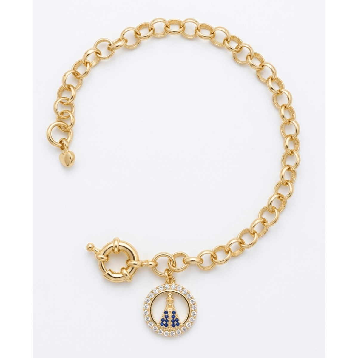 Pulseira Elos 6mm com Pingente Nossa Senhora Cravejado com Zircônias e diâmentro 20mmx20mm Banhada com 10 milésimo a ouro 18k, sendo a pulseira com 16cm de comprimento e fecho boia.